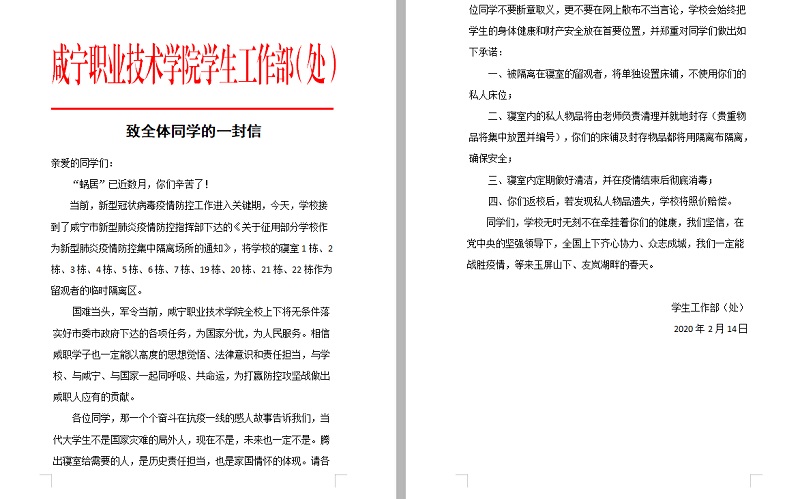 14日下午,校学工处紧急发布《致全体同学的一封信》,告知每位学生关于相关宿舍被征用作为新型冠状病毒感染的肺炎留观者临时隔离区的相关事宜。信件刚一发出,就得到了广大学生及家长的积极响应,大家纷纷表示:坚决以大局为重,愿意服从安排,齐心协力支持党和政府,一起打赢这次防疫阻击战。