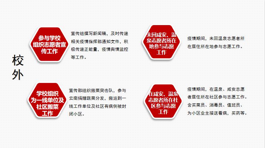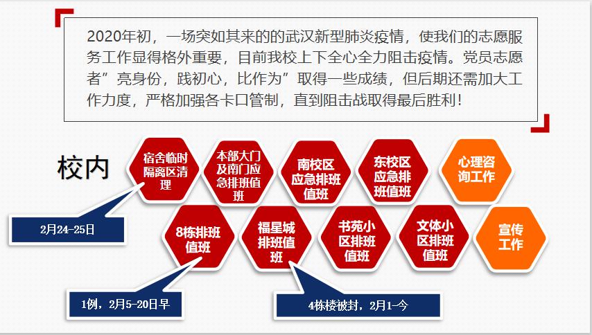 在新型冠状病毒疫情发生后,我校志愿服务团体和广大志愿者积极响应中央文明办、中国志愿服务联合会发出的《关于号召广大志愿者、志愿服务组织积极有序参与疫情防控的倡议书》,在市文明办指导下第一时间组织志愿者开展疫情防控志愿服务工作。截至目前我校发起了校属各小区应急值班、包保单位福星城小区疫情防控、云南等地捐赠蔬菜分发等志愿工作。