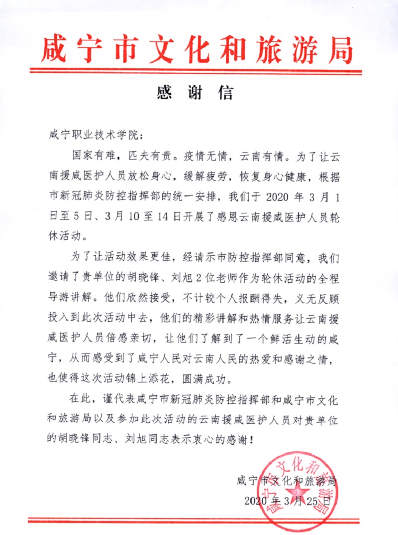 “胡晓锋、刘旭两位老师,不计较个人报酬得失,义无反顾投入到此次轮休活动中去,他们的精彩讲解和热情服务让云南援咸医护人员倍感亲切……使得这次活动锦上添花,圆满成功。”3月26日,党委书记王继成代表学校接受了市文化和旅游局送至学校的感谢信。信中,对我校胡晓锋、刘旭两位老师参与的“感恩云南援咸医护人员轮休活动”导游讲解服务提出了高度赞扬。