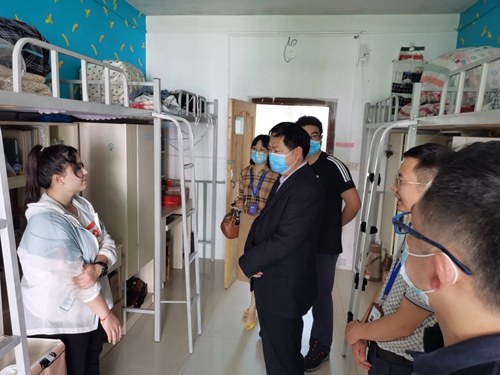 5月26日上午,党委副书记龚光松带队深入学生寝室看望慰问留校学生,学工处处长王旱伟、外国语学院党总支副书记熊鑫、学工处副处长陈宝珠等同志参加慰问。