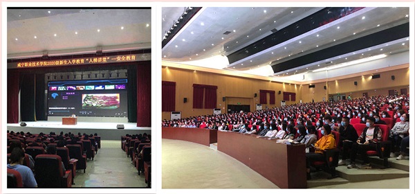 为提高新生的安全防范意识,10月12日晚,我校邀请了咸宁市公安局温泉分局、三号桥派出所干警在科学会堂为2020级5500多名新生开展入学安全教育。
