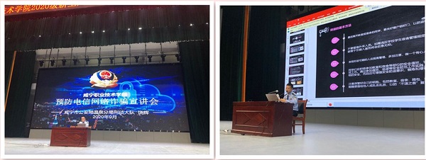 三号桥派出所民警刘启睿、三号桥派出所视频侦查员杜先知、咸宁市公安局温泉分局刑侦大队民警饶辉分别以《校园安全的类型与防范》《认识新型毒品,远离毒品》和《电信诈骗的预防》为题,图文并茂、深入浅出、通俗易懂地向新生们讲解了校园安全的类型,如何防盗、防事故发生;结合图片讲解了如何认识新型毒品,远离毒品;结合典型案例特别是本地区的典型案例说明了如何识别电信网络诈骗,如何防范电信网络诈骗和“非法校园贷”等基本安全常识及处置方法。