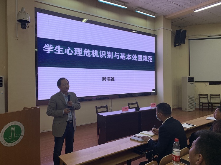 10月30日下午,学校在教一201组织进行了辅导员心理育人技能提升工程第七期《大学生心理危机识别及基本处置规范》专题培训,邀请我校特聘专家武汉大学心理健康教育中心主任赖海雄教授作主讲嘉宾,学校党委副书记龚光松出席并主持。参加培训的有各学院党总支书记,分管学生工作副院长、副书记,全校专兼职辅导员,学工处、保卫处、心理健康教育中心等部门相关工作人员。