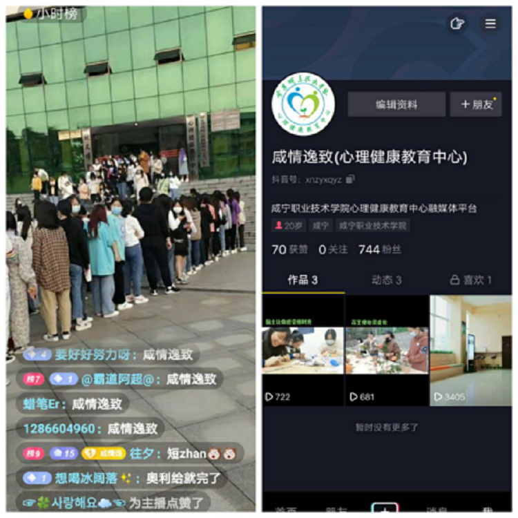 线上线下有机结合,充分宣传学校心理健康教育资源。结合疫情防控常态化特点,心理中心积极打破往年同学们到心理中心实地参观的常规做法,开展了“抖音看中心”的直播和小范围实地参观相结合。直播中同学们一边观看心理中心的各个功能室,一边在直播中与主播进行互动答疑,此举也是我校心理中心在自媒体背景下创新心理健康教育模式的一种探索。通过宣传学校心理健康教育资源,让学生们深深感受到学校对学生心理健康的关爱,更让学生知晓如遇到心理困扰可以积极求助。