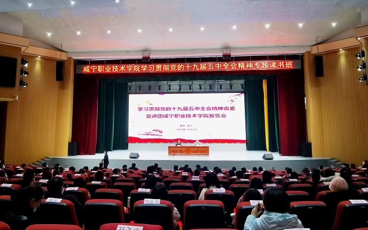 12月3日,我校举办“深入学习习近平新时代中国特色社会主义思想、学习贯彻党的十九届五中全会精神专题读书班”。特别邀请华中科技大学马克思主义学院教授文红玉,武汉大学马克思主义学院党委书记罗永宽两位湖北省委宣讲团成员,及咸宁市纪委副书记、市监委副主任、一级调研员张文秋先后作专题辅导报告。校党委书记王继成主持报告会并讲话,全体校领导、全校副科级及以上干部、全体无课教职工共近500人参加了学习。