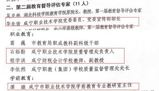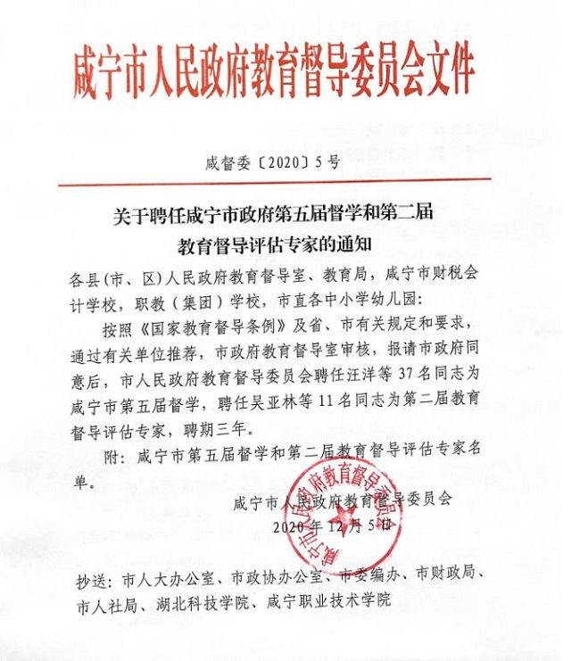 近日,咸宁市人民政府教育督导委员会公布了《关于聘任咸宁市政府第五届督学和第二届教育督导评估专家的通知》,我校党委委员、宣传部(统战部)长华先宙,质量管理处负责人石裕勤,教师程学洪、谭璇等4人被聘为咸宁市教育督导评估专家、督学。