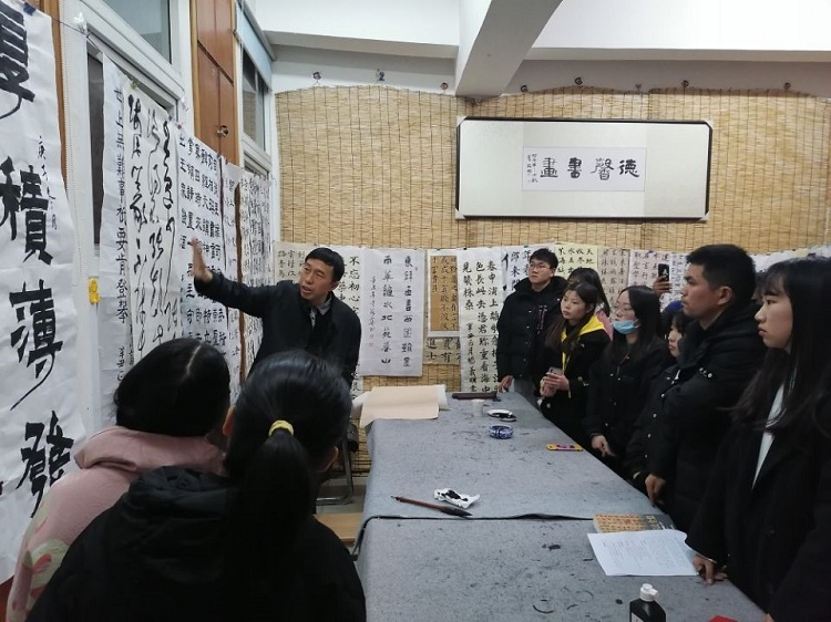 活动中,艾老师为学生们解读了各类层次专业书法比赛征稿的要求,从书写规范、书写特色等方面带领大家赏析了各类赛项中获奖、获展的书法作品,分享了自己研习书法的心得,并从结构布局、线条细节、笔墨色彩等方面对学生提交的书法作品逐一进行点评指导,并现场进行了书写示范。