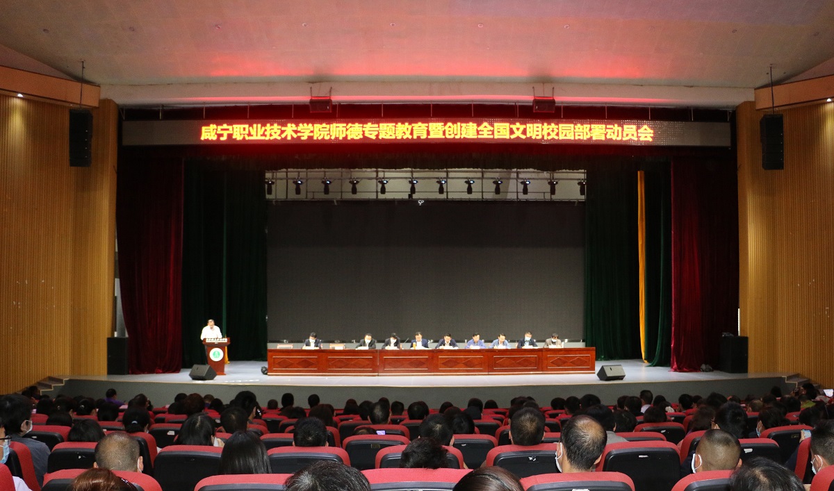 为全面推进教师思想政治和师德师风建设,加快构建高质量教师队伍建设新格局,为全面推进全国文明校园创建工作,不断提升学校办学水平,5月21日下午,在科学会堂召开“咸宁职业技术学院师德专题教育暨创建全国文明校园部署动员会”。全体校领导、教职员工参加会议,党委副书记、校长高焕清主持。