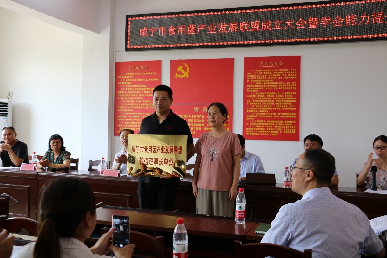 随后,我校生物工程学院曾青兰教授简要介绍了咸宁市食用菌产业发展联盟的概况,联盟采用统一采购、统一研发、统一制种、统一制棒、统一标准、统一销售、分散出菇“六统一分”的运行模式。她对联盟的顺利运行充满信心,同时勉励与会代表要齐心协力发展壮大咸宁市食用菌产业,助力乡村振兴。接着洪春霞为首任轮值理事长单位授牌,王卓仁、徐绳武为联盟副理事长单位授牌。