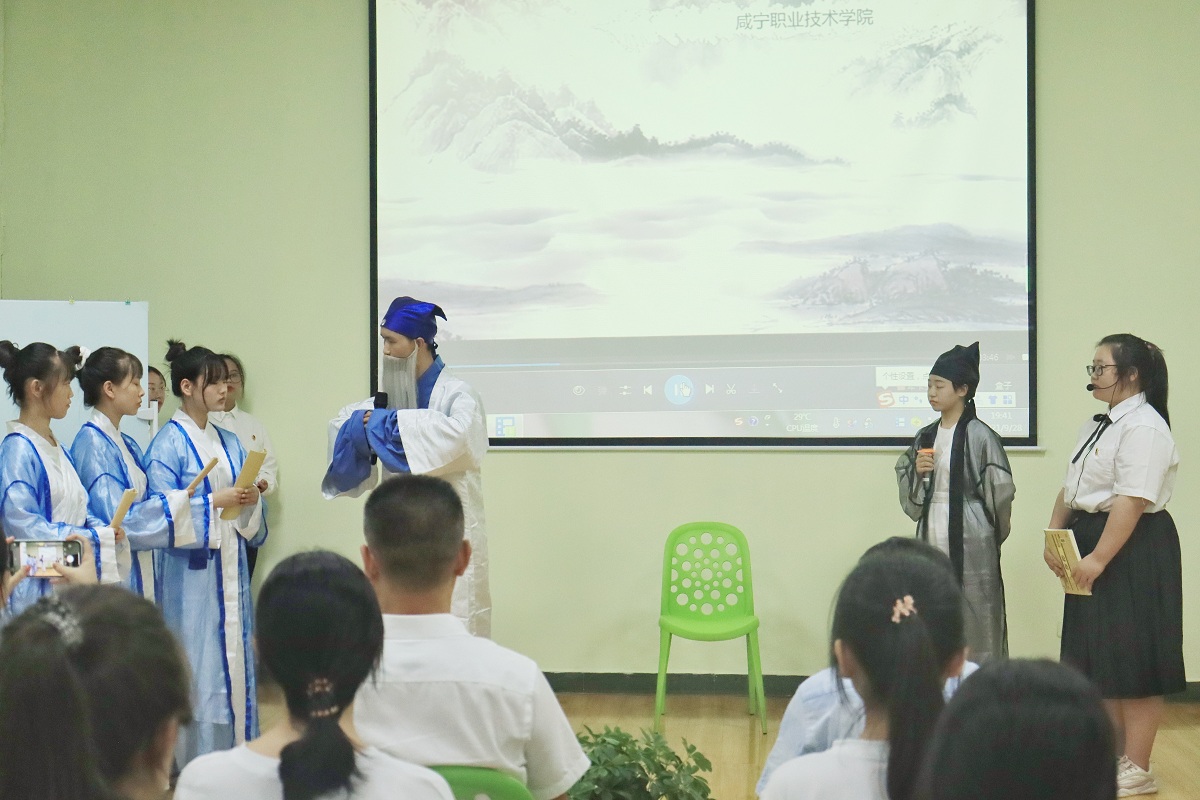 分享会上,学生们演绎情景剧《与孔子的对话》,只见他们身穿广袖汉服,手捧《论语》,仰望中华文化的灿烂星空,穿越千年,再现与孔子的“经典对话”;书法协会的三名学生用篆、隶、楷三种书体书写《论语》选句。参与活动的专业教师为学生讲解了关于书体等书法常识,从仁、义、礼、智、信等方面与学生分享了《论语》的魅力,勉励大家要成为有德、有才、有形之人。