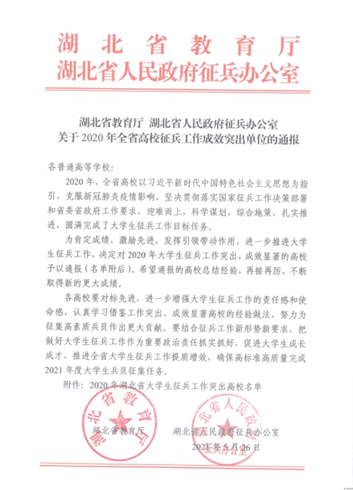 11月17日,我校收到湖北省教育厅、湖北省征兵办下发的表彰文件,我校评为2020年度征兵工作成效突出单位。这是继2013、2014、2015、2016、2017、2018年后(2019年未开展评选),学校连续第七年获得此项荣誉。