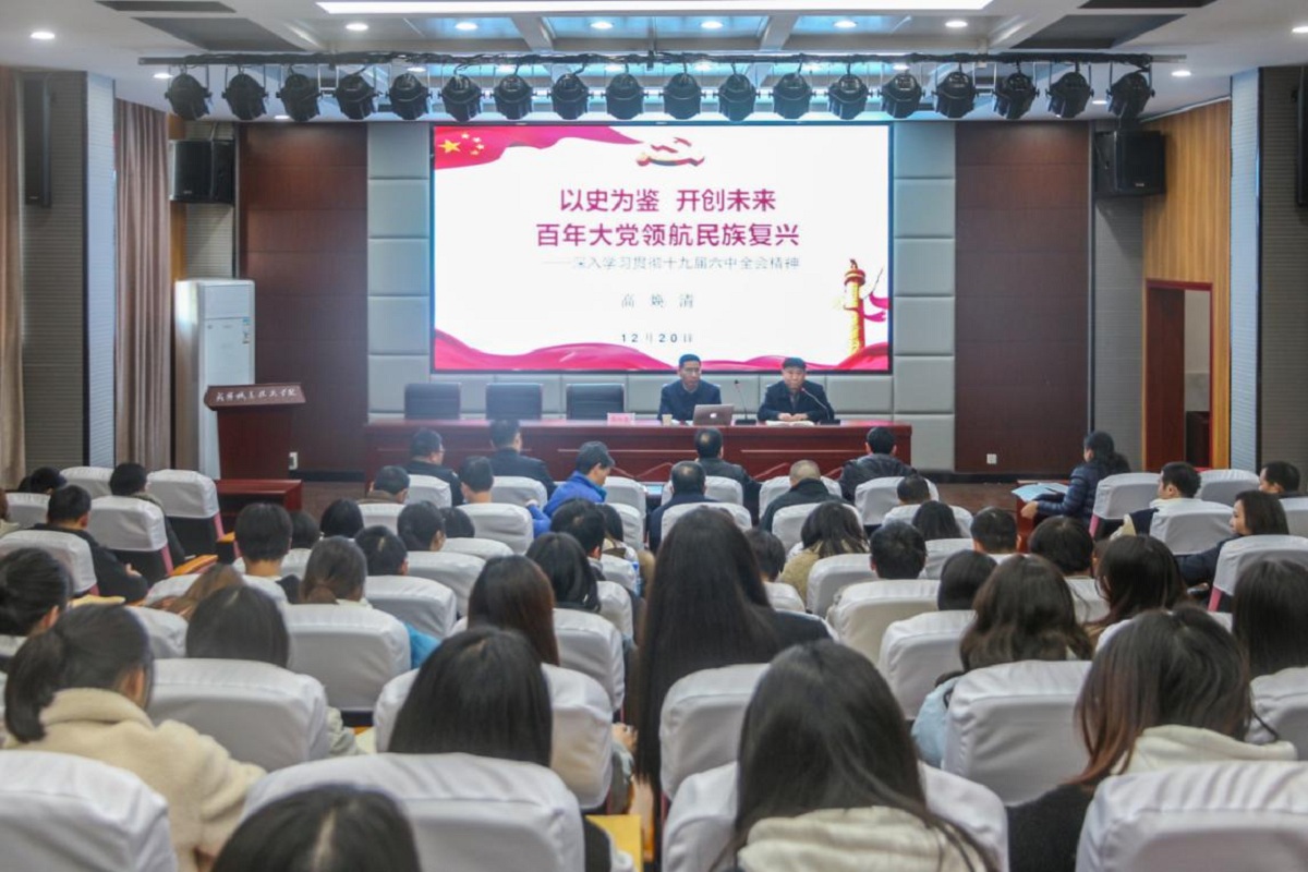 12月20日,在教育楼201报告厅,党委书记高焕清以《以史为鉴开创未来,百年大党领航民族复兴》为题,面向200余名师生宣讲党的十九届六中全会精神,并强调,学习贯彻全会精神及《中共中央关于党的百年奋斗重大成就和历史经验的决议》(以下简称《决议》)精神是当前和今后一段时期的重要政治任务,要提高政治站位、思想觉悟和理论水平,牢牢把握社会主义办学方向,坚持立德树人;始终坚持人民至上的宗旨,以学生为本;全面贯彻落实新发展理念,推动学校高质量发展;充分发挥社会主义制度优势,加强党的建设,为党和国家的教育事业提供更多更好的服务。