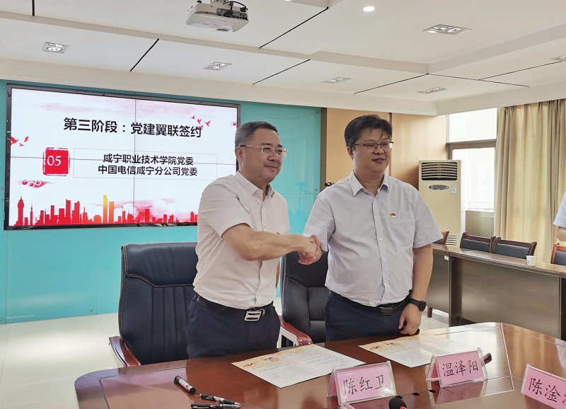 为落实新时代党的建设总要求,进一步探索创新党建工作模式,增进院校与企业党组织之间的优势互补,切实将党的政治优势转化为发展共赢的推动力,以高质量党建引领我校高质量发展。9月30日下午,我校党委与中国电信咸宁分公司党委在行政楼308会议室举行了“党建翼联”合作协议签约仪式。校党委副书记、校长陈红卫,中国电信咸宁分公司党委书记、总经理温泽阳出席会议,会议由我校党委副书记龚光松主持。