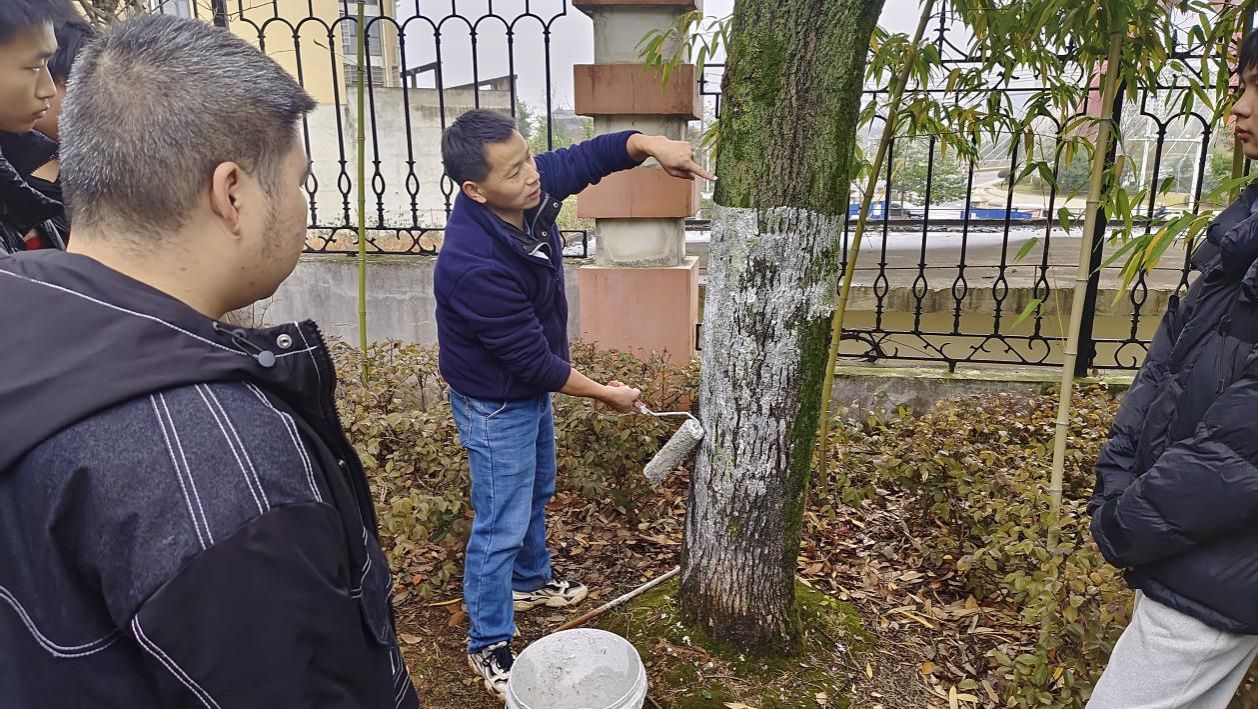 寒冬将至,为增强校园树木抗寒防冻防虫能力,确保树木安全过冬,锻炼学生的动手能力,12月13日“七彩树”嫁接社团在校园内开展志愿刷白活动。指导老师徐群刚带领社团全体学生参加。