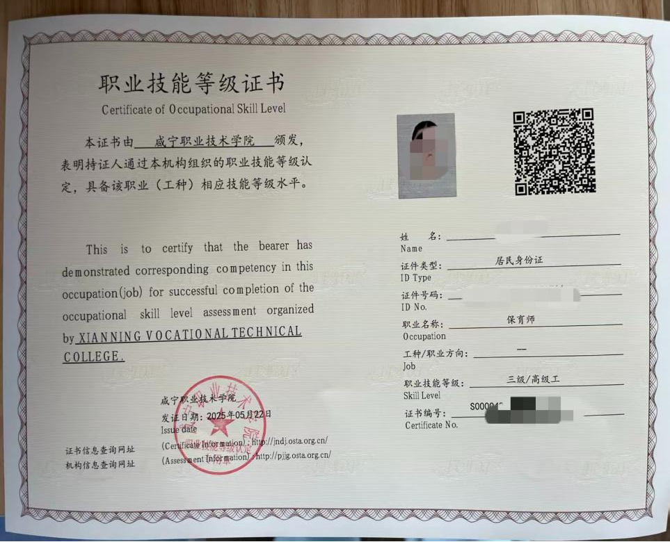 幼儿教师资格证、普通话等级证书、保育师职业技能等级证。