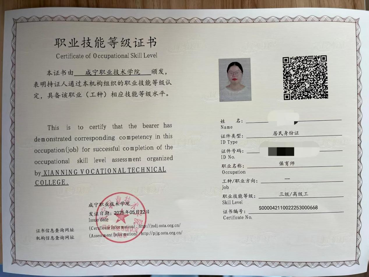 幼儿照护(中级)职业技能等级证书、幼儿教师资格证、保育员资格证、育婴师职业资格证。