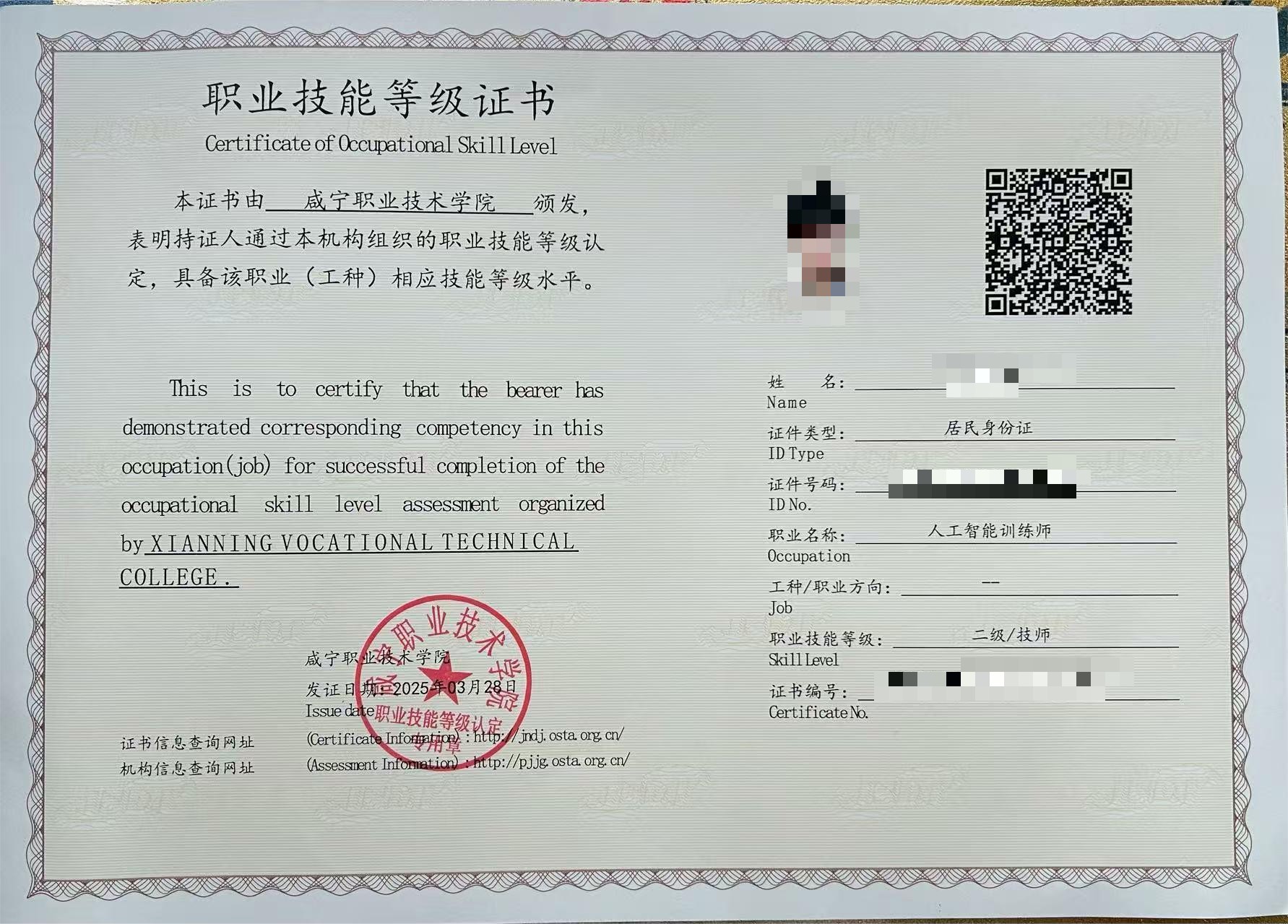 本专业实行“1+X”证书制度,在校期间学生通过学习至少获得一个以上的国家职业技能等级证书,包括人工智能数据处理职业技能等级证书(中级),人工智能训练师(高级)、人工智能前端设备应用(中级)证书、AIGC应用工程师(高级)等。