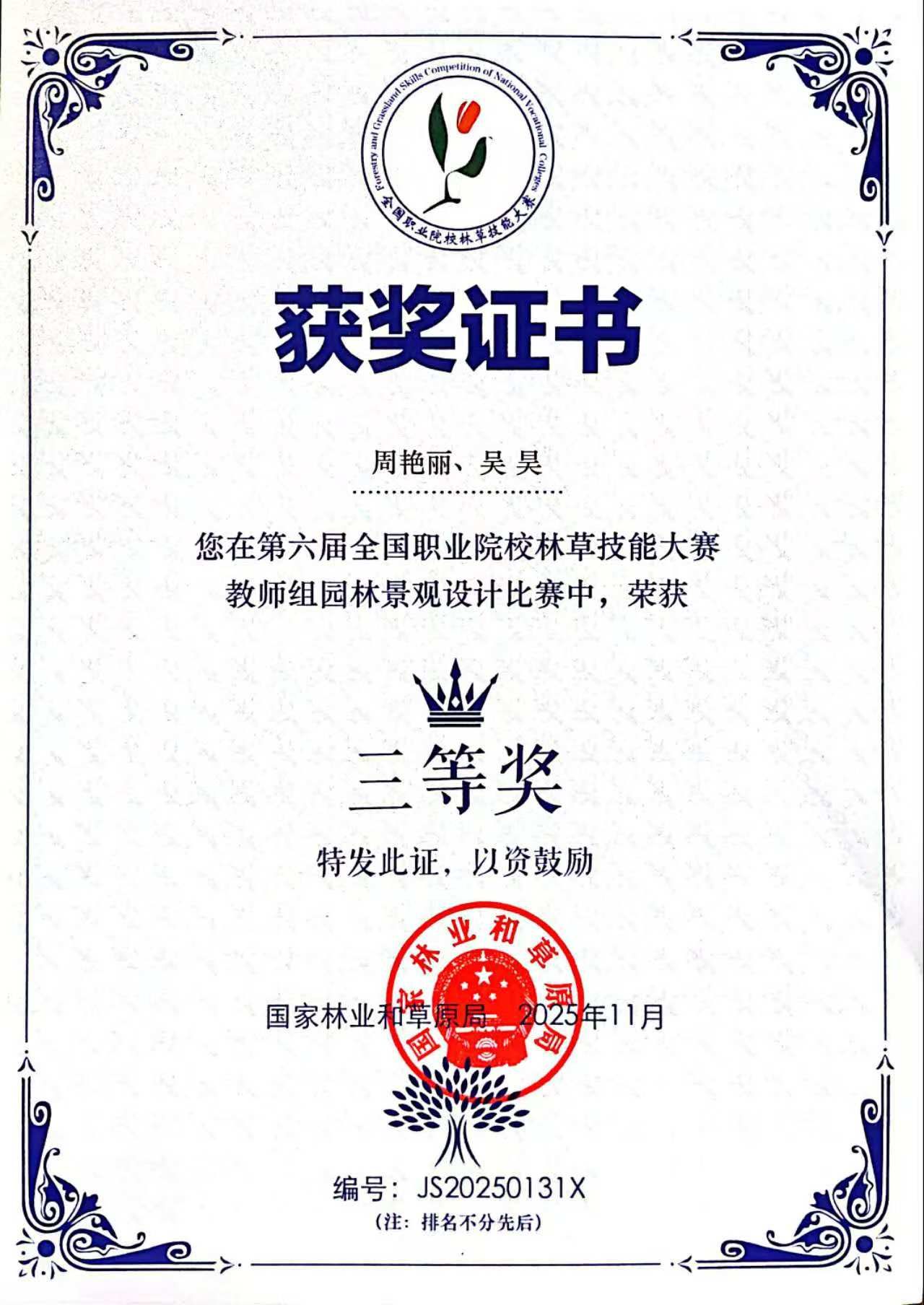 14 | 2025-11在刚刚落幕的第六届全国职业院校林草技能大赛中,我校现代农业技术专业群周艳丽、吴昊两位教师凭借卓越的专业能力,在竞争激烈的“园林景观设计”赛项中荣获三等奖,为校争光。作为我国林草技能领域级别最高、影响力最广的全国性行业赛事,本届大赛以“技能兴林草绿智向未来”为主题,深度聚焦美丽中国与乡村振兴战略核心需求,赛题设置极具行业前沿性与实战挑战性。赛事要求选手在3小时内完成兼具独创性、经济性与落地可行性的景观设计方案,全面检验专业创意、技术应用与综合解决问题的高阶能力。比赛中,周艳丽、吴...