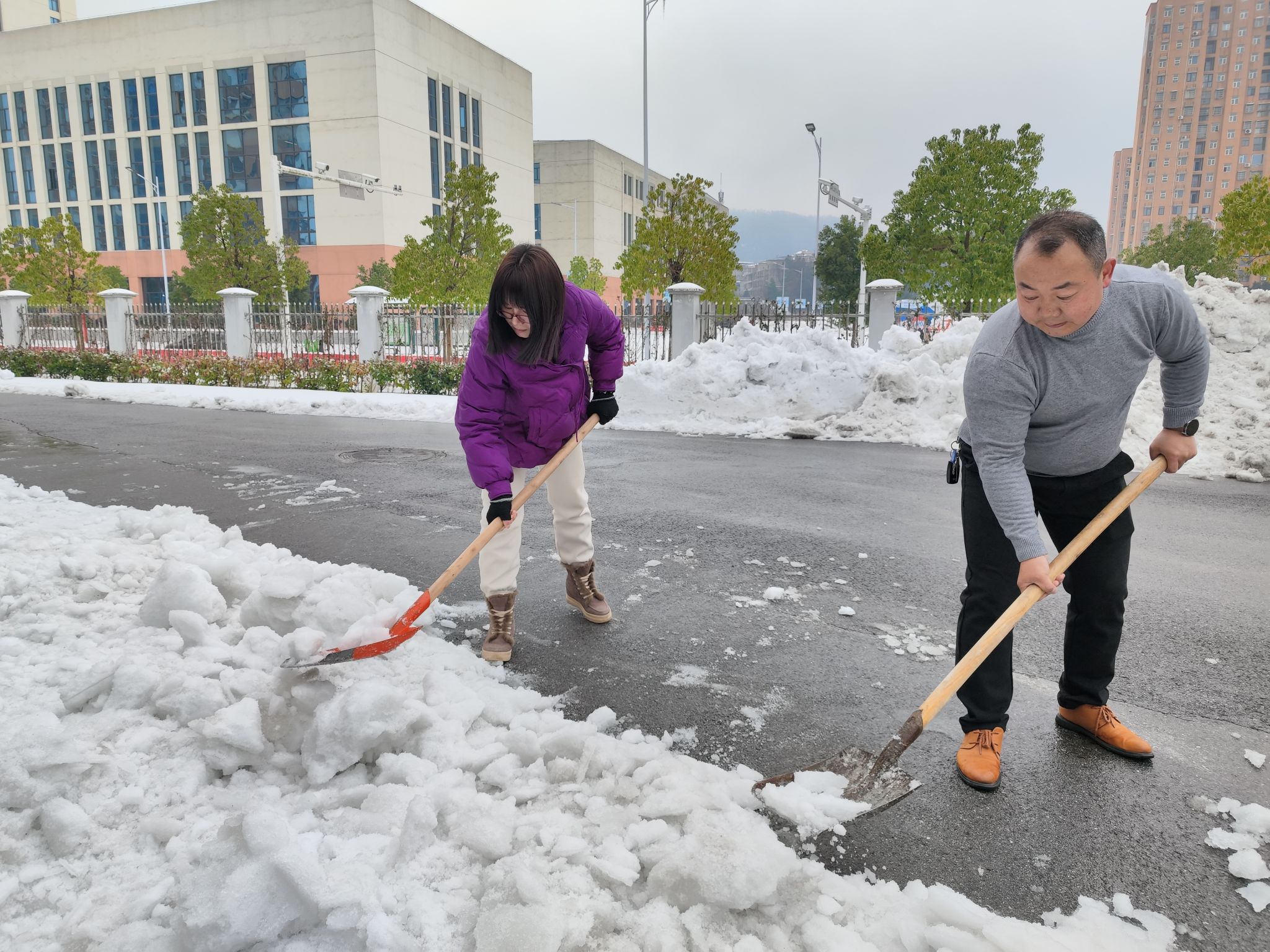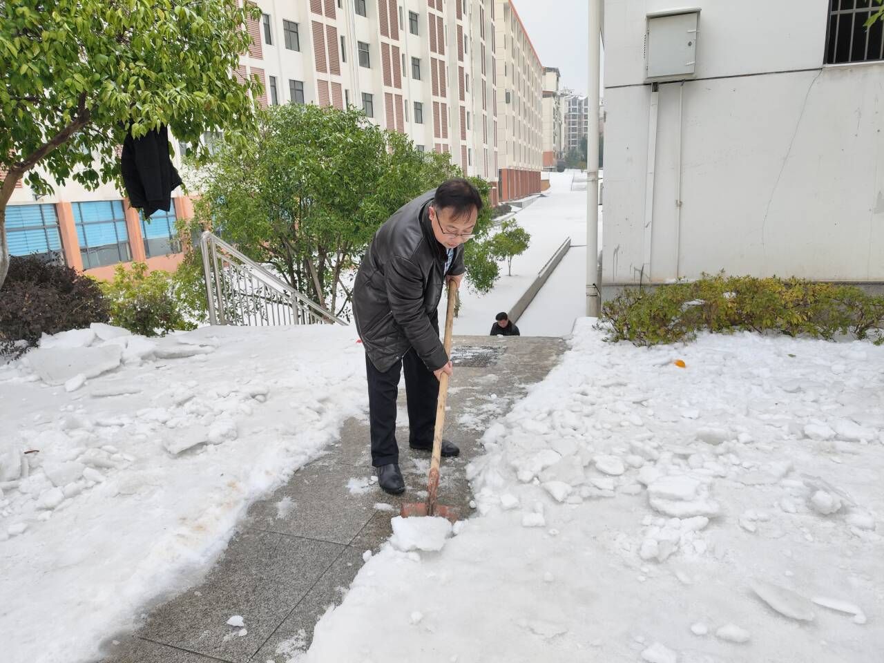 24日下午,在接到学校关于号召全校教职员工参与清雪活动通知后,院领导第一时间做出安排部署,及时与校办及兄弟院系沟通,确定包保区域及人员分工,并迅速协调和动员院部职工自备工具,确保清雪除冰活动能够有序开展。