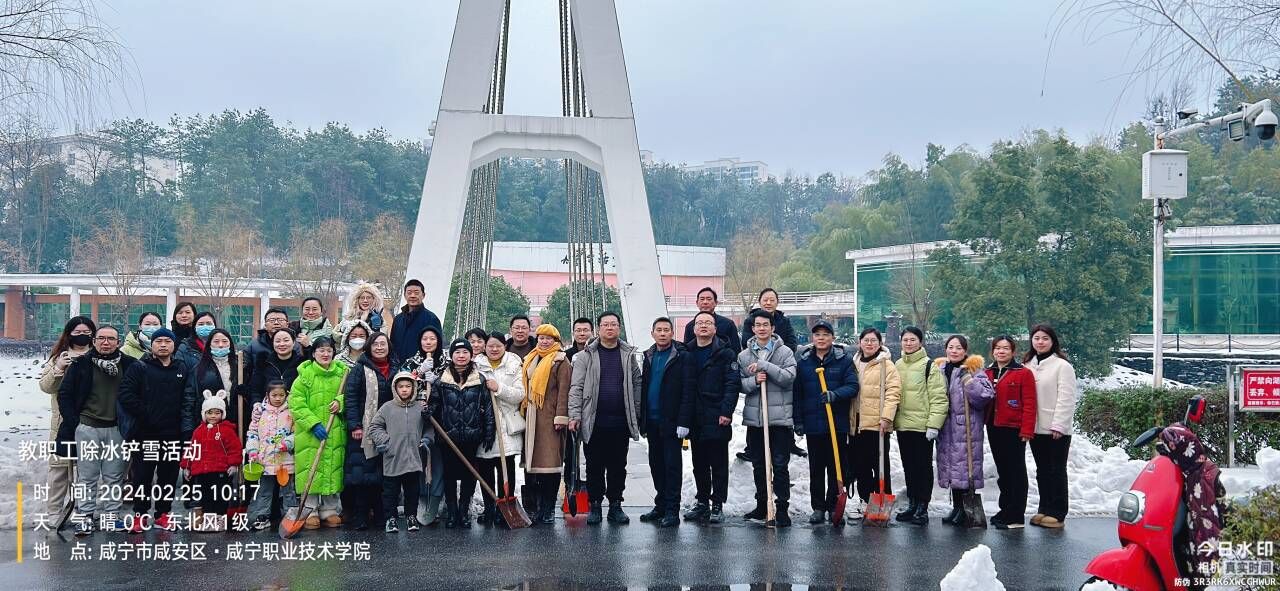 近日,受大风寒潮冰冻雨雪天气影响,咸宁职业技术学院校内道路、教学场地结冰积雪。面对冰与雪的考验,为有效保障学生校园安全,以及新学期开学的正常进行,根据学校下达的通知,人文艺术学院全体师生开展了“消冰除雪”活动。