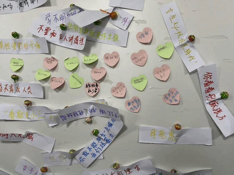 白色纸板上贴满小纸条,后面有一粒糖果,纸条上写着“女孩子读那么多书干嘛”“学得好不如嫁得好”“不要和女生讲道理”“女人三十岁就没人要了”“头发长见识短”等世俗对女性的偏见。