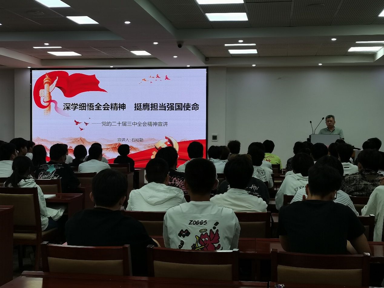 为引导2024级新生深入理解党的二十届三中全会精神,将个人成长与国家发展紧密结合,用青春力量为时代添彩,9月24日,我院党总支书记石裕勤为同学们开展了党的二十届三中全会精神宣讲活动,2024级全体新生代表参加。