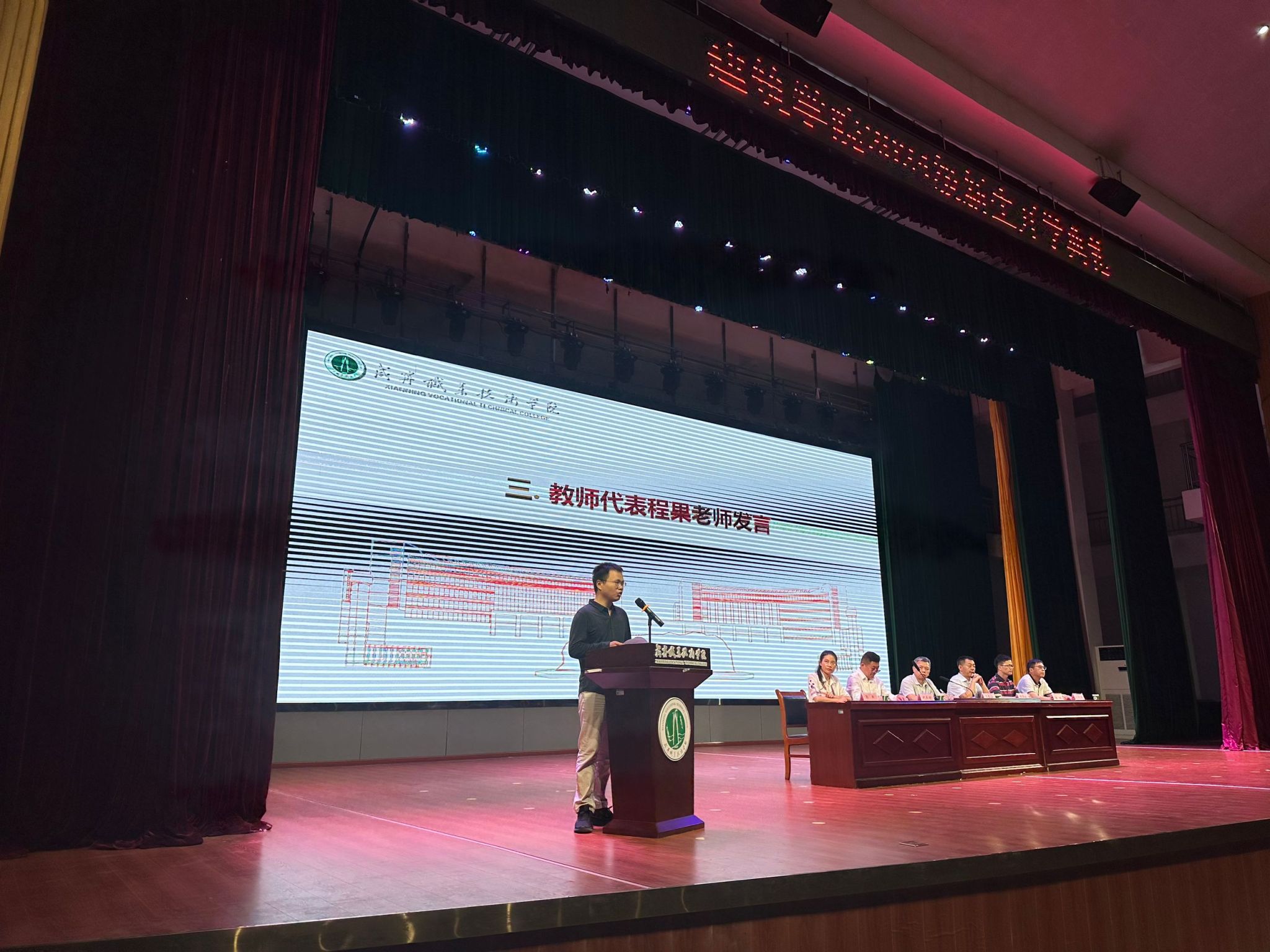 教师代表程果老师随后上台发言,他以自己多年的教学经验和人生阅历,寄语新生要珍惜大学时光,勇于探索未知领域,敢于挑战自我极限。