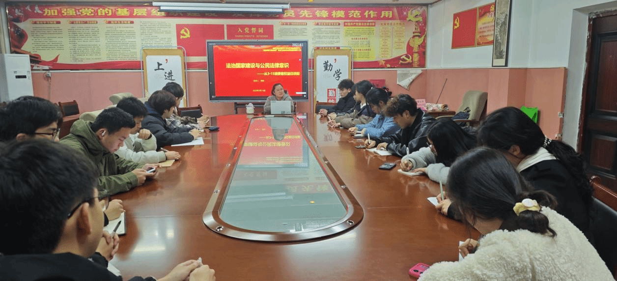 在"3·15国际消费者权益日"来临之际,为推进青年学生法治教育走深走实,强化青年学生法治思维,培育知法守法、懂法用法的时代新人。3月15日,信息工程学院开展"法治国家建设与公民法律意识"主题政治学习活动。学生支部熊林老师主讲,24级各班团支书参加。