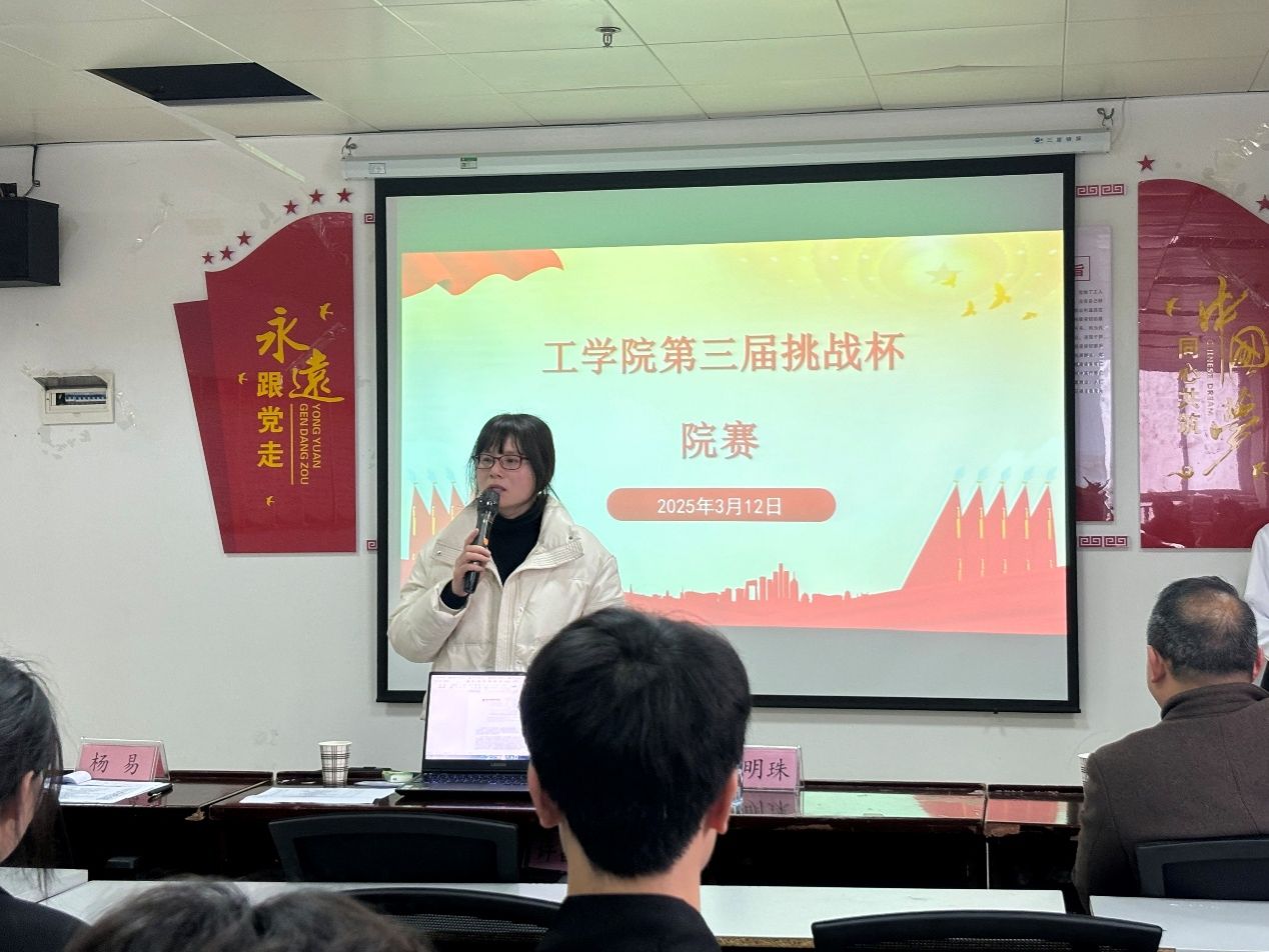 3月12日下午,工学院在理工楼904成功举办第三届“挑战杯”大学生创新创业大赛院赛。本次大赛以激发学生创新潜能、培养创业精神为目标,吸引了众多学生参与,最终17个涵盖多领域的优秀项目通过筛选进入院赛。此次活动由工学院团总支统筹组织,并邀请工学院党总支书记柳明珠、副书记许维林、学生科科长杨易担任评委,为团队提供专业指导。