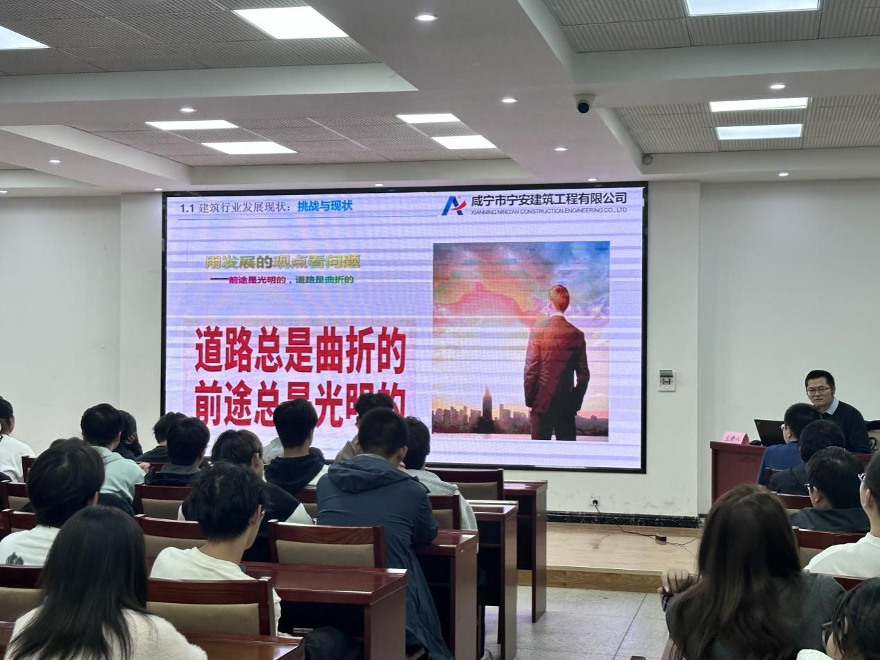 为深入学习贯彻党的创新理论,加强对入党积极分子的思想引领,进一步坚定理想信念,增强专业自信,2025年10月29日下午,在建筑学院与咸宁市宁安建筑工程有限公司校企联合党支部启动首次主题党日活动中,我院特邀校企联合党支部党员、公司副总经理陈斌博士,为全体入党积极分子主讲《基建强国的脊梁与未来》专题党课。