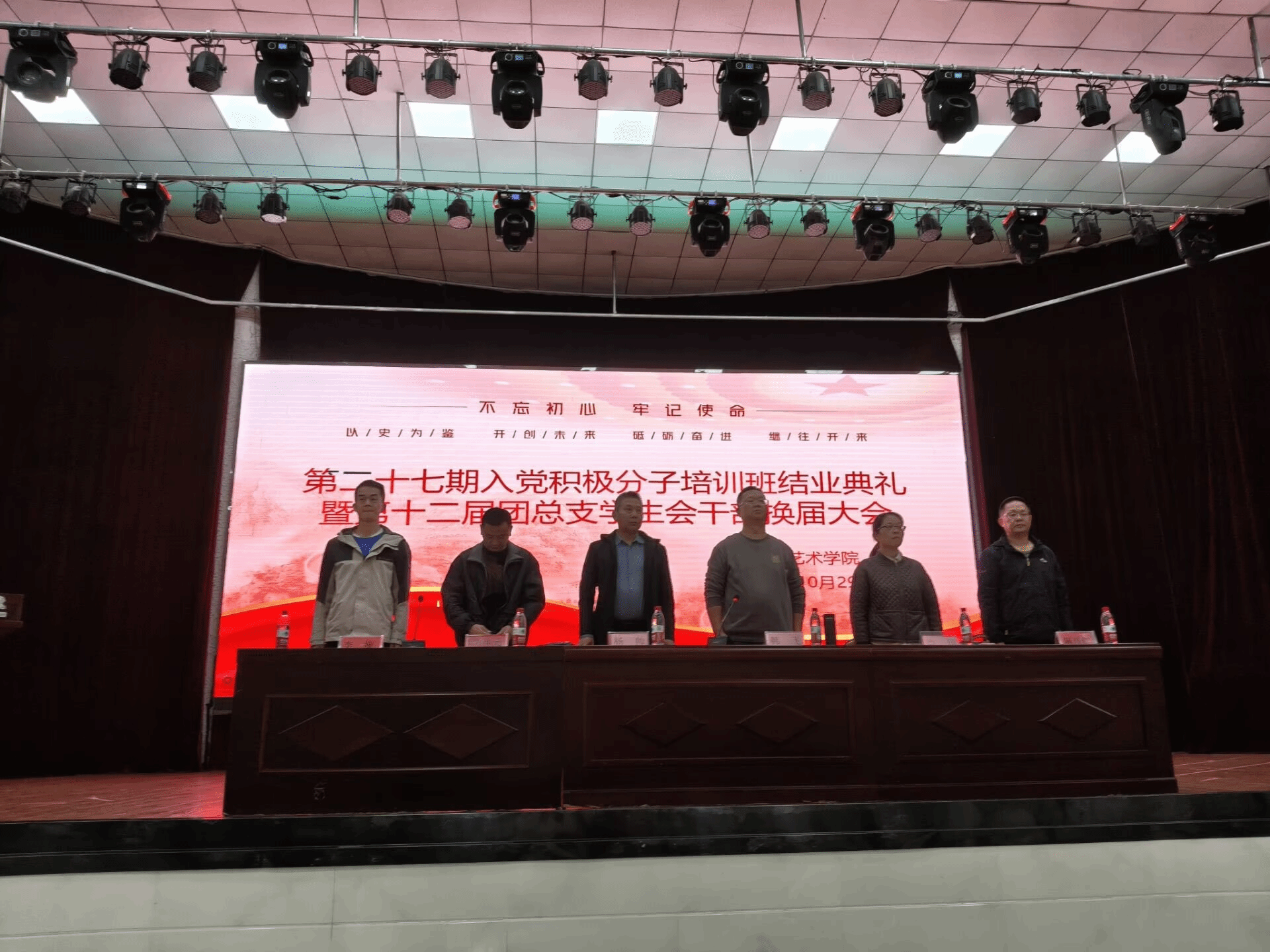 10 月 29 日,人文艺术学院第二十七期业余党校结业暨第十二届团总支学生会干部换届大会在大学生活动中心举行。大会由学院党总支书记韩飞主持,党总支副书记杨帅、教学副院长肖琼、党总支纪检委员方生元、学生科长陈传红、团总支书记李操、第十一届学生干部及全体入党积极分子和2025级学生会成员参会。