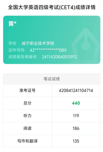 自踏入咸宁职业技术学院的校门,她便为自己定下了清晰的学习目标——夯实专业基础,考取实用证书,为未来发展积蓄力量。她主动挑战英语四级考试,每天坚持晨读背单词、晚上刷题练听力,克服了英语学习的畏难情绪,最终顺利通过;面对中小学教师资格证的严苛考核,她系统梳理教育学、心理学知识点,反复打磨试讲流程,凭借扎实的专业功底和从容的临场表现成功获证;此外,她还考取计算机二级证书、普通话二甲证书,用硬核实力为自己的简历增添亮色。扎实的学习态度让她连续两个学年斩获国家励志奖学金,成为同学们眼中“靠谱又优秀”的学习榜样。