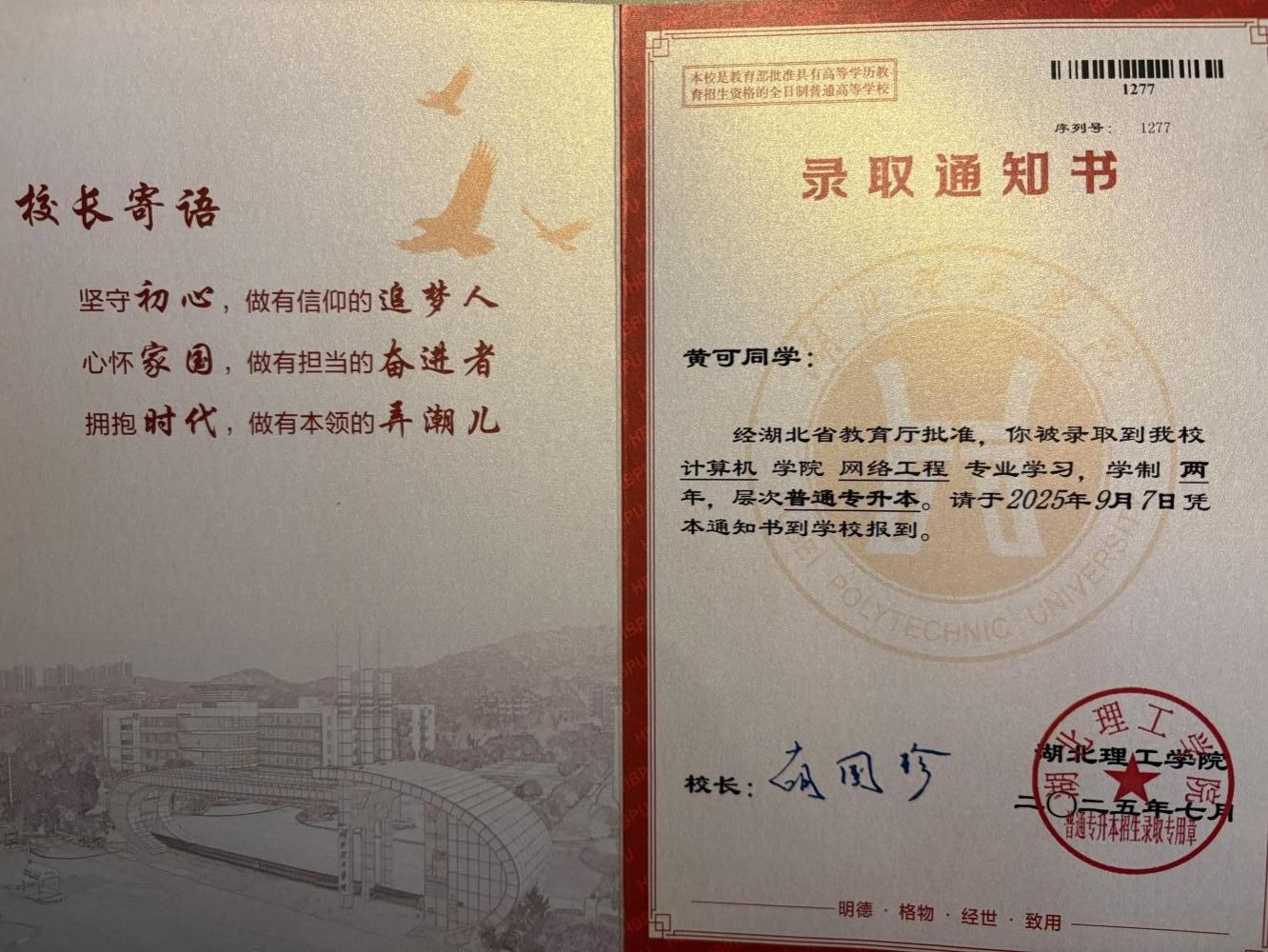 从连续两年斩获国家励志奖学金,到手握多项实用证书,从班级里的“热心学委”到竞赛场上的“实力选手”,再到圆梦本科的追光者,她以认真的学习态度、热忱的处事风格、坚定的追梦信念,在咸职的三年时光里不断成长、不断突破。正如她给辅导员的信中所说那样,咸职是她逐梦之路的起点,而未来,带着这份勤奋与热忱,她必将在更广阔的天地里,书写出更加精彩的人生篇章。