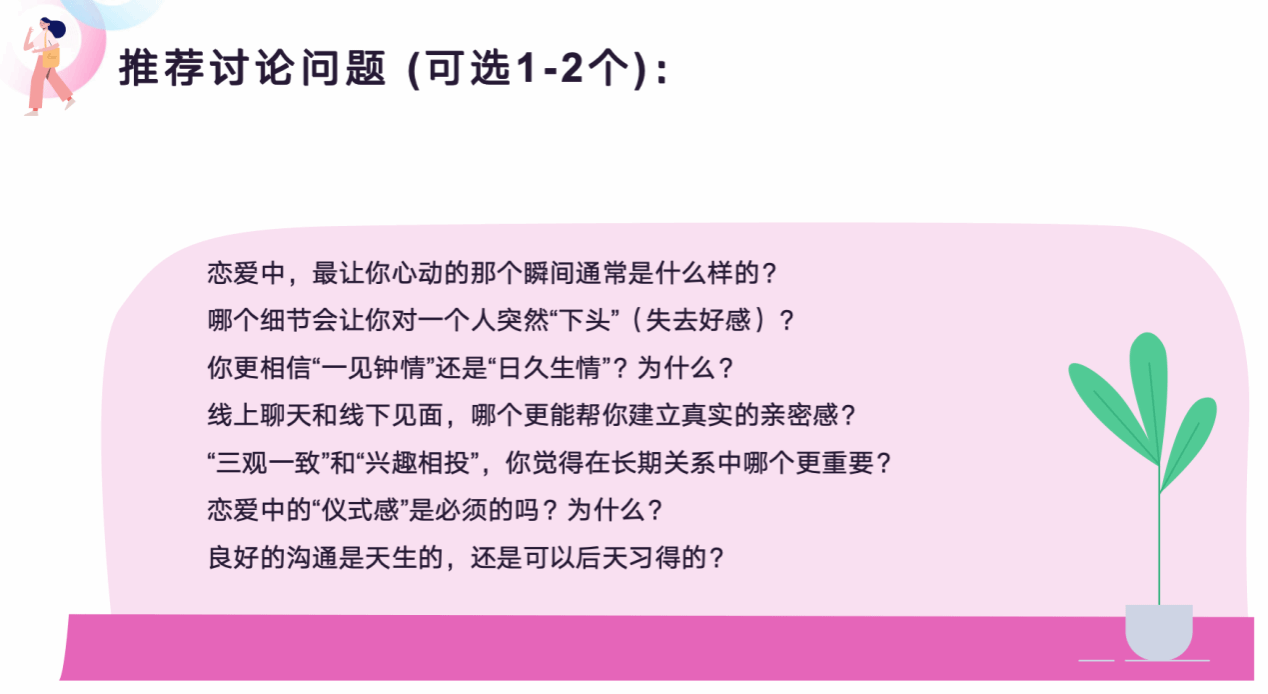 随后的环节中,一些蕴含智慧的文学与流行文化中的“恋爱金句”被引入讨论,为轻松的氛围增添了一抹哲思与浪漫色彩,引导同学们从更多元的角度感受爱情的不同层面。
