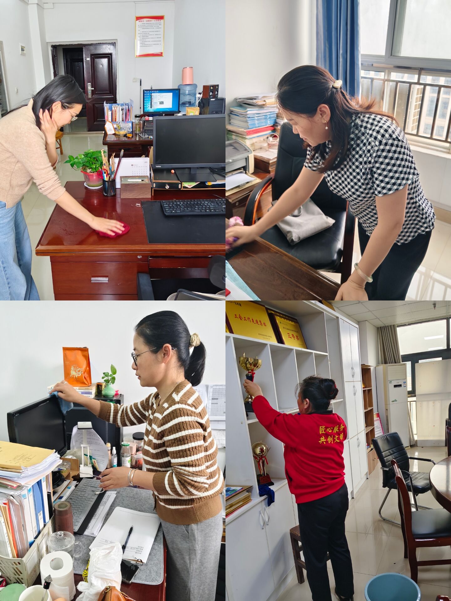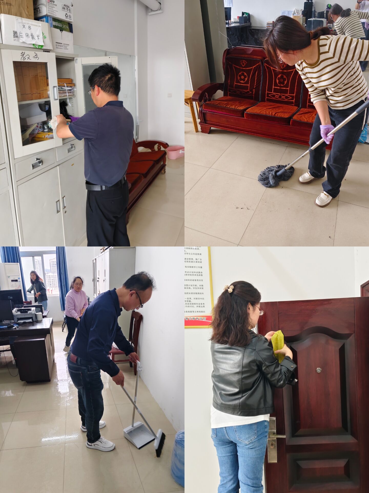 活动现场,教师们热情高涨、分工协作,对教学楼、办公室、实习实训室、走廊楼道、公共区域面积及卫生死角进行全面清理。大家手持扫帚、抹布、拖把等工具,认真擦拭门窗桌椅、清扫地面垃圾、清除墙面污渍、整理教学用品,“不放过一处细节、不遗留一个盲区”。党员干部、部门负责人和教师骨干率先垂范,带头攻坚难点区域,充分发挥先锋模范作用。