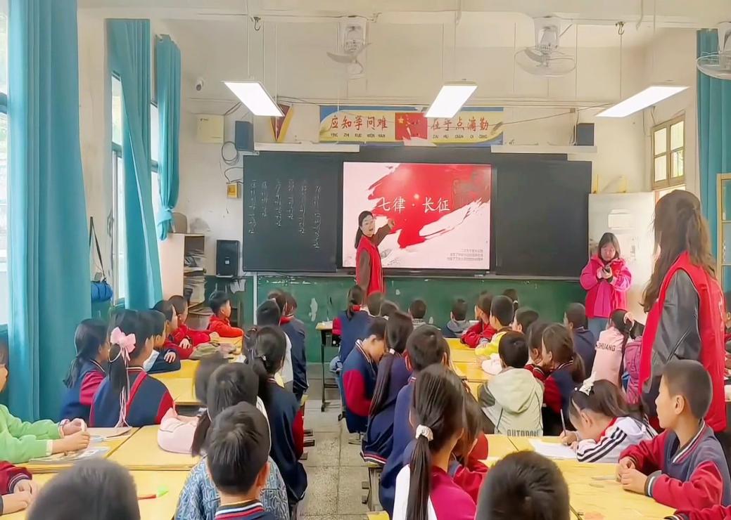 与此同时,支部党员舒飞霞同志带来《七律·长征》红色经典课堂,从长征历史背景切入,讲述红军长征的艰难历程与伟大壮举,带领孩子们认读字词、理解诗意、诵读经典,感悟红军不畏艰险、乐观向上的英雄气概,在琅琅诵读中让红色基因浸润童心,让爱国情怀深植心底。