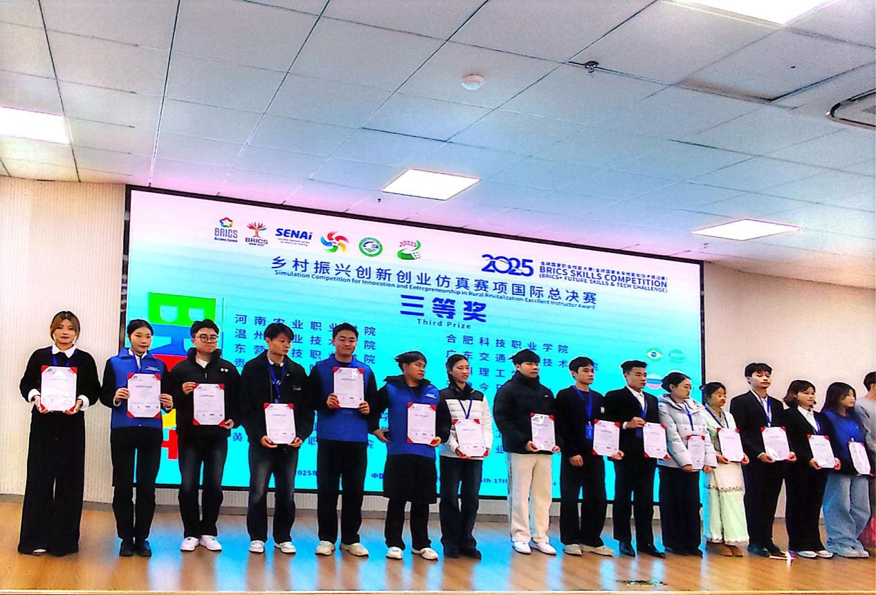 11月16日,2025年金砖国家职业技能大赛(乡村振兴创新创业仿真赛项)国际总决赛在鄂尔多斯生态环境职业学院圆满落幕。由我校援疆教师徐群刚指导的双河职业技术学院现代农业技术专业2024级学生李璐毅、楚定权、张浩冉,凭借扎实的专业功底和出色的现场发挥,在激烈竞争中脱颖而出,荣获大赛三等奖。这一成绩不仅实现了双河职业技术学院在该项赛事中“从无到有”的历史性突破,也创下了该校的首个奖项纪录,是我校全力支援新疆职业教育发展、深化教育援疆工作取得的又一重要成果。