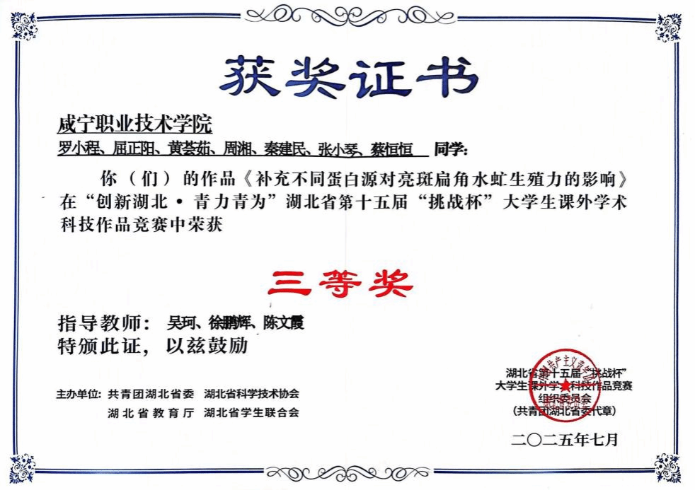 2025年7月,他又携《补充不同蛋白源对亮斑扁角水虻生殖力的影响》项目,斩获湖北省第十五届"挑战杯"大学生课外学术科技作品竞赛三等奖。这项研究为循环农业和饲料蛋白可持续供应提供了新思路,展现了他在农业种质资源开发领域的探索。