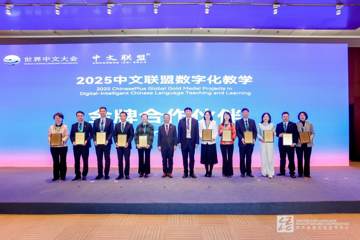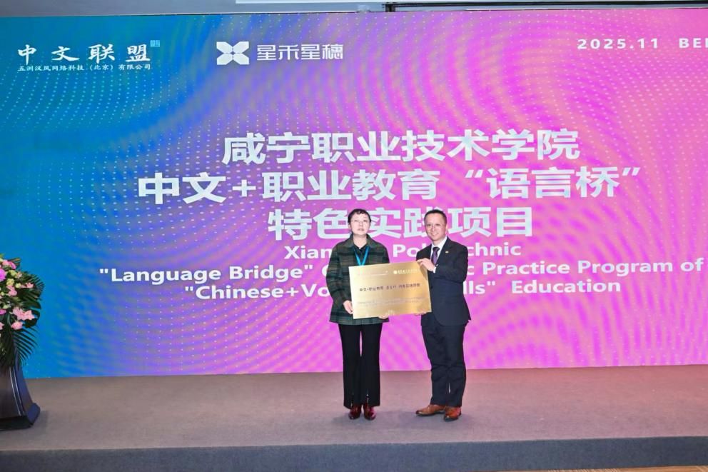 11月14日至16日,由教育部主办,中外语言交流合作中心等单位共同承办的2025世界中文大会在北京国家会议中心隆重举行。本届大会以“创新引领 数智赋能——让中文零距离”为主题,中外政府官员、专家学者、高校负责人和国际组织代表等约2000人到会,我校派出通识教育学院院长程丽群一行四人参会。会上,我校被授予中文+职业教育“语言桥”特色实践项目牌匾,并荣膺“2025全球中文联盟数智化教学金牌合作伙伴”。