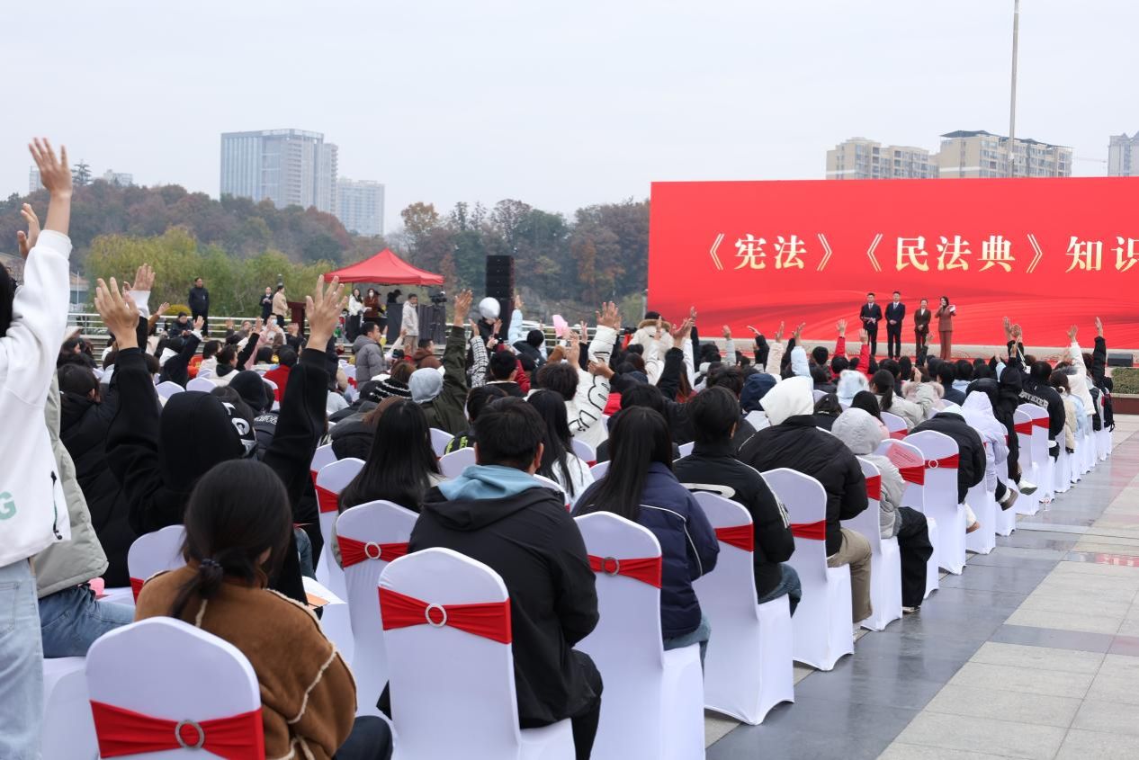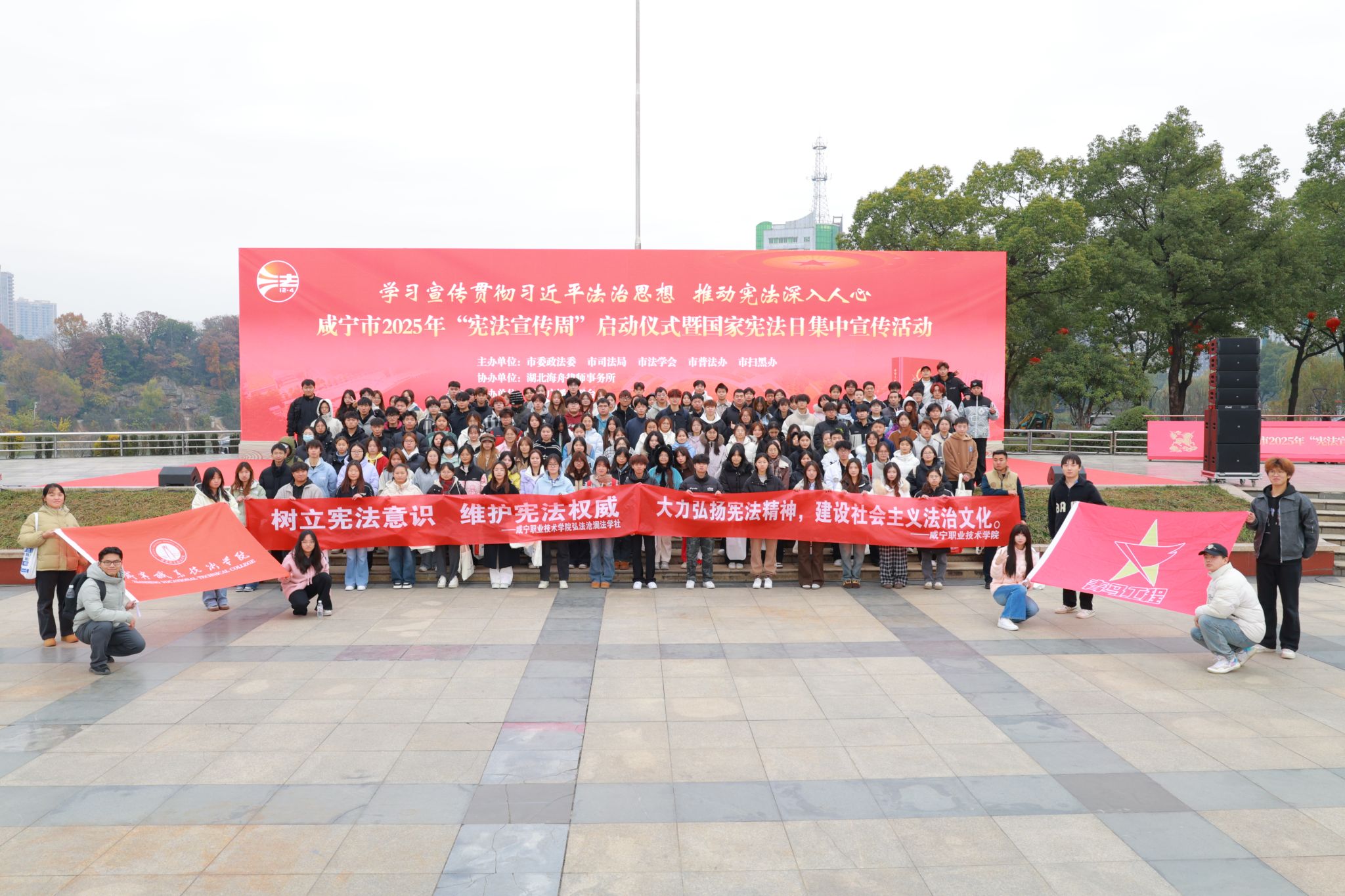 为深入学习宣传贯彻习近平法治思想,引导我校青年学生尊崇宪法、学习宪法、遵守宪法、维护宪法、运用宪法,12月4日,在我国第十二个国家宪法日、第八个“宪法宣传周”启动之际,我校精心组织180名学生代表,前往市人民广场参与咸宁市2025年“宪法宣传周”启动仪式暨国家宪法日集中宣传活动,以沉浸式体验推动宪法宣传教育在我校学子中走深走实。